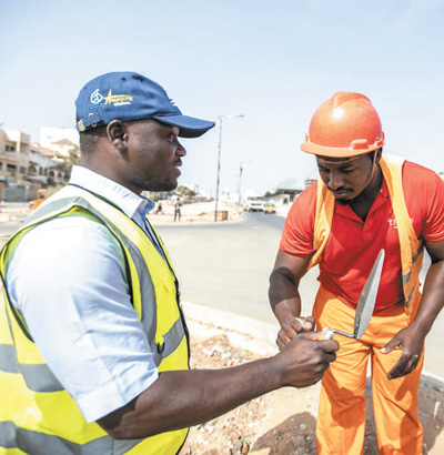 塞内加尔达喀尔快速公交项目是塞内加尔第一条城市快速公交线路。这条长约18公里的道路将穿过达喀尔人口密度最高的社区和核心商务区,建成后有助于缓解首都交通压力。图为当地员工在项目建设工地交流。