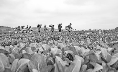 在云南省文山壮族苗族自治州砚山县,农民在一家蔬菜基地收获蔬菜。